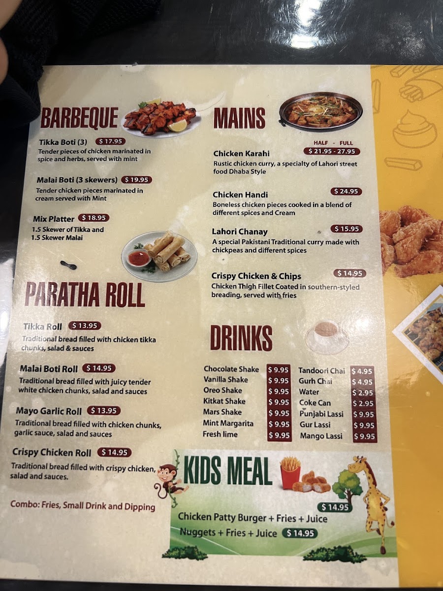 Marinated Chicken Chunks in special Pakistani style shawarma spices, wrapped in soft pita bread, with pickled cucumber, carrot and onions and special sauces.