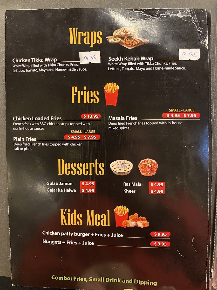 White Wrap, Filled with Tikka Chunks, Fries, Lettuce, Tomato, Desi fusion special sauce, Mayo, BBQ sauce.